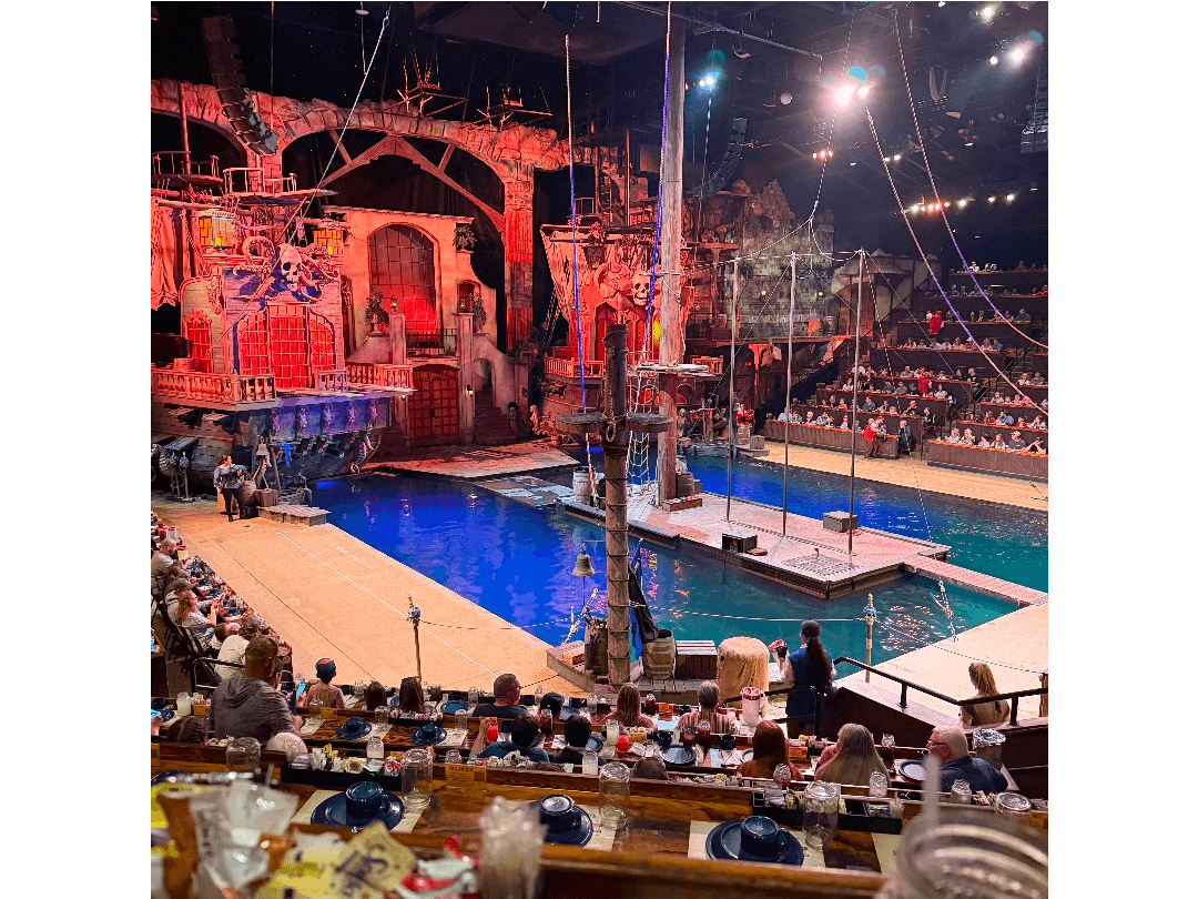 The Pirates Voyage Pigeon Forge arena seats about 700 guests in a 30,000 square feet arena that features a 300-000-gallon indoor water stage and two 25-foot pirate ships.
